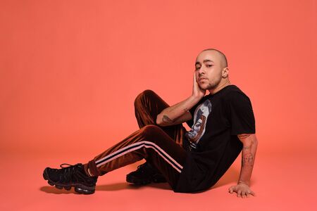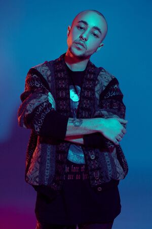 Studio shot of a young tattoed bald man posing against a colorful background. 90s style.