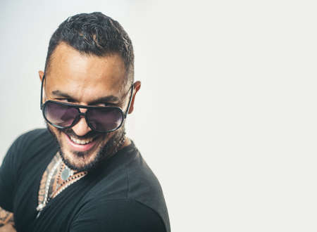 Portrait of stylish happy smiling handsome young man. Fashion guy with sunglasses.