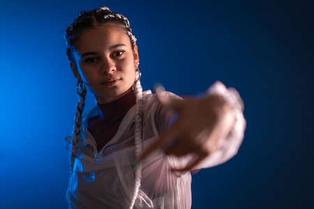 Dancing mixed race young girl in studio light. Female rap performer show expressive hip hop dance