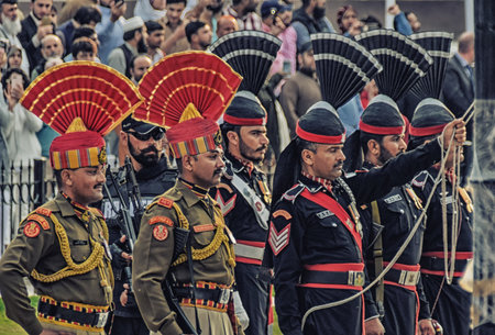 Wagah, India - March 13, 2019: The marching Pakistani and Indian guards in national uniform at the ceremony of lowering the flags on the border between Pakistan and India, Wagah, Lahore, Pakistan
