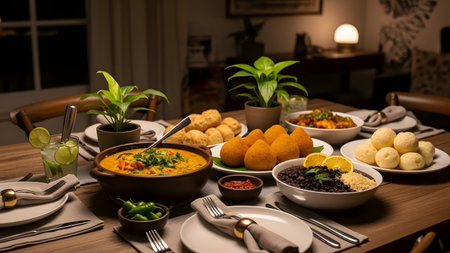 A warm and inviting dinner table spread featuring traditional Brazilian dishes. The meal includes a clay pot of moqueca, a bowl of feijoada with black beans, coxinhas, cheese bread, and fresh sides.