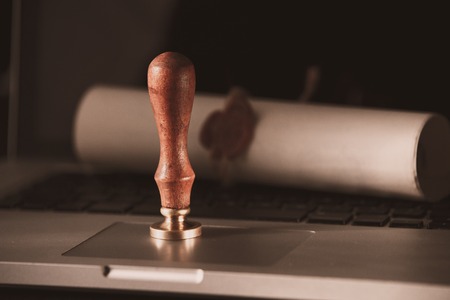 Close-up of a notarys hand stamping with approved stamp on certificate or document public.