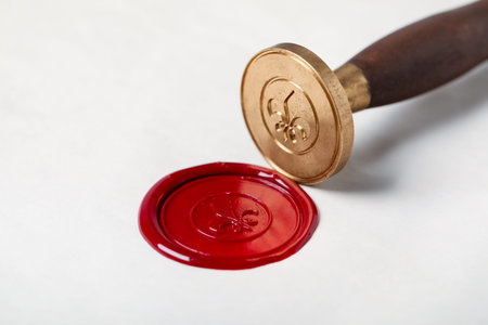 A close-up shot captures the moment a traditional brass stamp is pressed onto a document, creating an elegant wax seal.