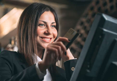 Credit card in hands female receptionist returning it to client after accepting payment