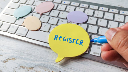 Register Online Sign Up Enrollment Concept with Hand Writing on Speech Bubble Note Pad and Computer Keyboard