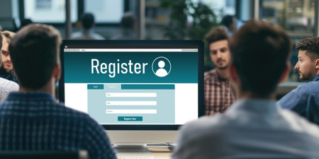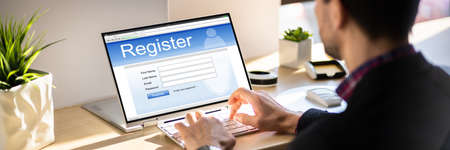Businessman's Hand Filing Online Registration Form On Laptop In Office