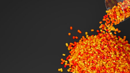 Top view of colorful plastic polypropylene granules pouring from the glass on a black backdrop, masterbatch polymer grain pile. HDPE or PVC resin pellets. Place for text. 3d render illustration