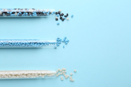 Colorful plastic granules in test tubes on light blue background, flat lay. Space for text