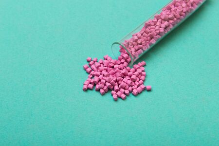 Plastic pellets. Pink Plastic granules from the tube on a turquoise background. Plastic Raw material .