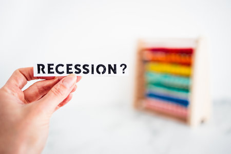 cost of livng and recession conceptual image, hand holding Recession? sign in front of colorful abacus