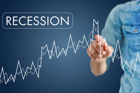 recession and stagnating economy conceptual image with text next to clipboard showing a multitude of stas and graphs