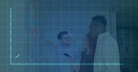 Pointing man with phone leading team with polka-dot dress woman at sticky note wall, showing grid. Collaboration, ideation, office, teamwork, brainstorming, data, visualization