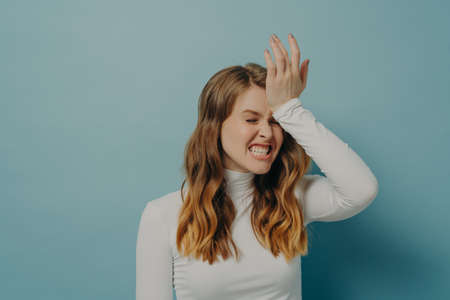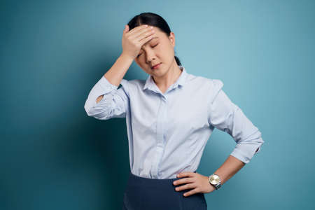 Stressful woman with brown hair wearing casual clothes holding hand on head having disappointment and stressful situation, looking frustrated with eyes closed isolated on blue with free space