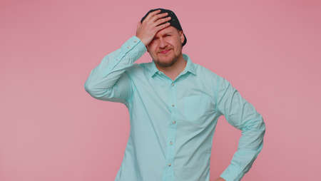 Sincere man 30s years old in blue shirt wish, waiting for good luck and loses becoming surprised sudden lottery results, bad fortune loss. Young adult guy boy isolated alone on pink background