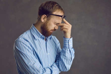 Headshot portrait of tired overworked exhausted adult business man entrepreneur rubbing eyes feeling fatigue and stress standing against grey studio copy space. People tiredness concept