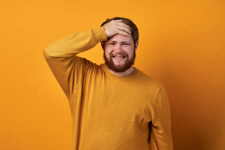 Image of a man in basic clothing, Close up of unhappy handsome guy with beard holding hair with hands. isolated on a yellow background. The bearded man