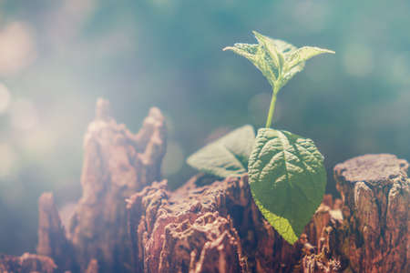 New Life concept with seedling growing sprout (tree). business development symbolic. A strong seedling growing in the stumps. Concept of building a future focus on new life. hope, freedom, life.