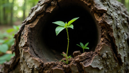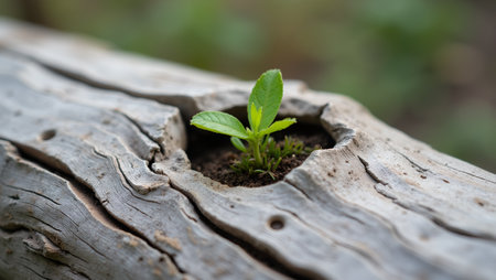 A young tree sapling emerging from a decayed trunk, showcasing the beauty of new life in old wood.