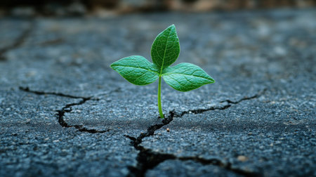 A small plant, showcasing vibrant green leaves, emerges from a crack in the gray pavement. The macro shot highlights the plant's resilience against a textured, cracked surface. Soft focus in the background creates a blurred effect. Suitable for illustrating themes of growth, renewal, and overcoming adversity in various applications.