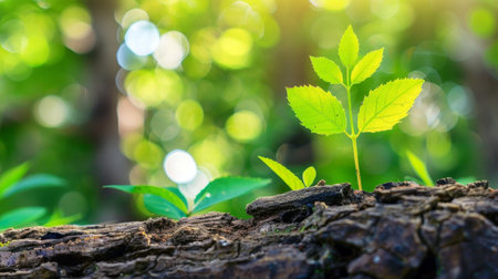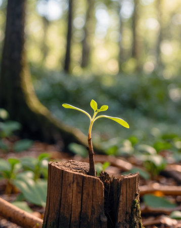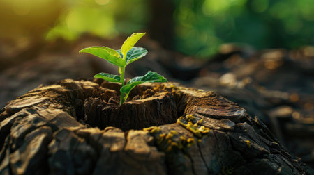 Fresh vibrant sprout, growing on a decaying, aged stump inside a shadowy woodland. The new growth is a striking symbol of hope and a sustainable future.