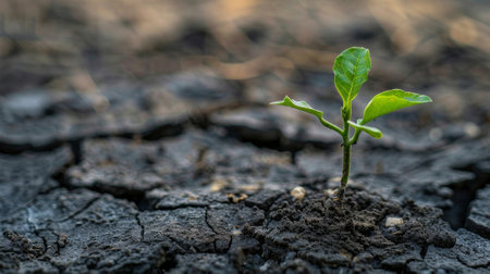 Resilient green plant emerges from cracked dry soil, symbolizing hope and perseverance in harsh conditions. This captures beauty of nature determination to thrive