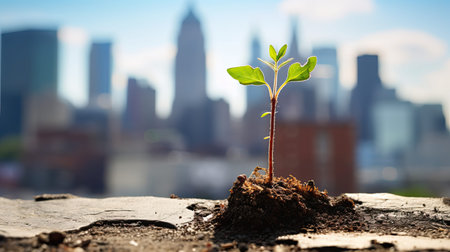 A symbol of growth and resilience, a young green plant sprouts from urban concrete against a blurred cityscape.