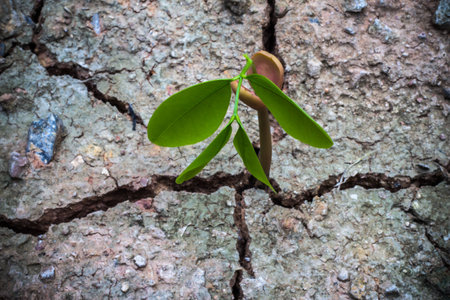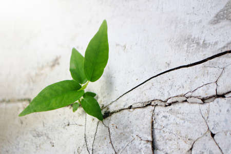 Green leaves plant grow from the cracked wall or street with copy space, growth ecology new life business Earth Day concept
