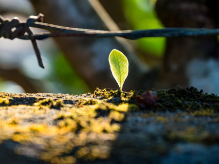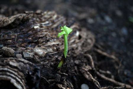 Green seedling growing on the ground piercing the leaf