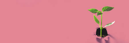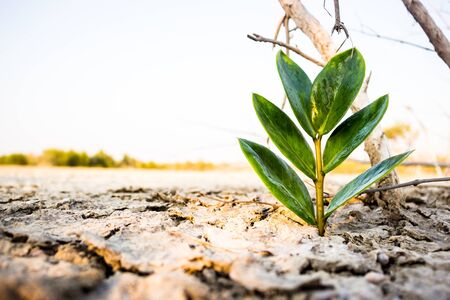 small plant growing in morning light at garden. concept earth day