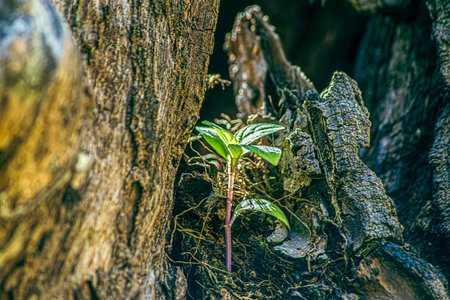 A strong seedling growing in the center trunk tree as a Concept of support building a future.. focus on new life future