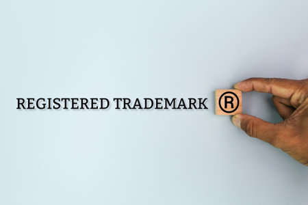 hand holding a wooden square with the letter R and the word REGISTERED TRADEMARK. the concept of a registered trademark.