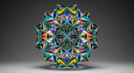A vibrant and colorful geometric sculpture with many facets and reflections