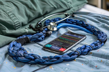 A stethoscope and a cell phone are placed on a bed. The image features a hand, purple textile, gadget, communication device, telephone, and more