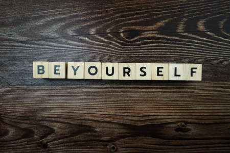 Believe in yourself sign spelled on wooden blocks and yellow background. Conceptual image of being true to yourself.