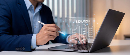A professional businessman in a suit uses a stylus pen while working on a laptop computer displaying a virtual interface focused on regulations and corporate compliance standards.