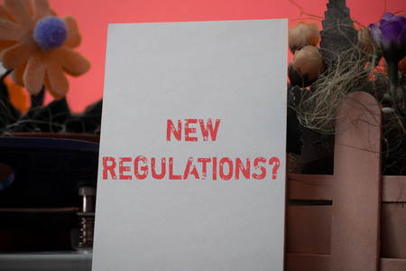 NEW REGULATIONS. Documents and office supplies on a gray office desk