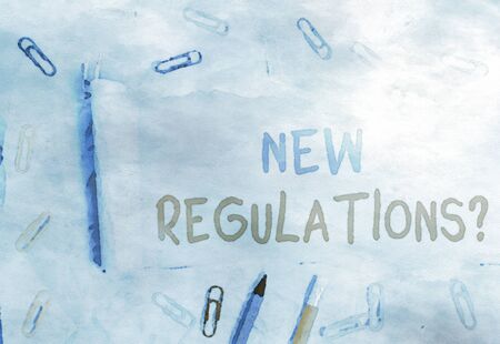 Conceptual hand writing showing New Regulations Question. Concept meaning rules made government order control way something is done Stationary and torn cardboard on a plain pastel table backdrop