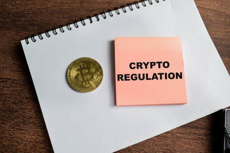 Concept of Crypto Regulation write on sticky notes isolated on Wooden Table.