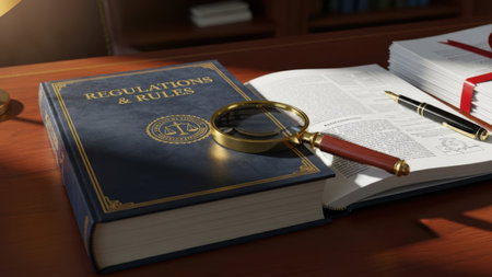 A high-angle, close-up shot captures a serious academic or legal setting on a polished wooden desk. A large, dark blue book prominently titled 'REGULATIONS & RULES' with gold lettering and a law symbol lies closed. Next to it, an open book displays text pages, where a magnifying glass with a brass frame and brown handle rests, suggesting careful examination or study. A black and gold pen lies alongside the open book. In the background, a stack of papers tied with a red ribbon adds to the professional atmosphere, evoking themes of law, order, study, and thorough investigation.