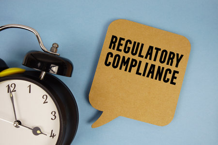 Regulatory Compliance text with alarm clock on blue background