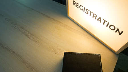 The registration lightbox and Black Leather Book on wooden table for event with copy space.