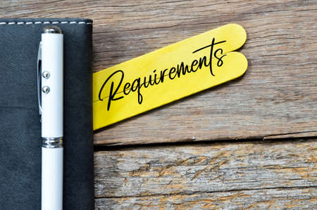 Top view of pen, notebook and ice cream sticks written with text REQUIREMENTS.