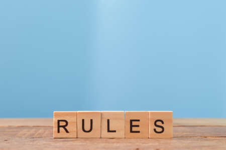 Wooden square letters with text RULES on wooden table