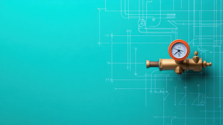 A detailed pressure gauge and copper valve against a teal backdrop, complemented by a technical blueprint design, suitable for engineering and plumbing visuals.