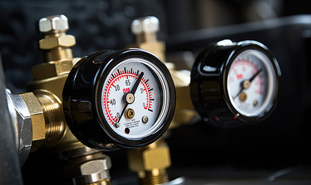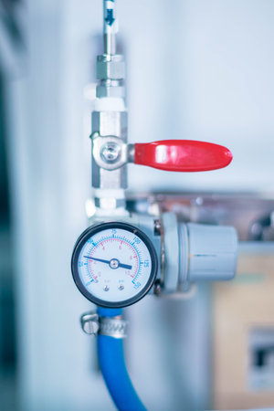 Closeup of pressure manometer measuring gas pressure, industry background, selective focus, pipes and valves in the chemistry laboratory