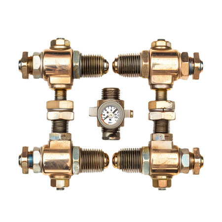 T shaped pipe connectors with bolts and a central pressure gauge on a transparent background