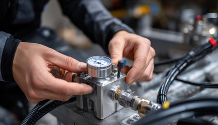 Close-up of a hand adjusting a valve on industrial machinery, illuminated by an amber light, showcasing mechanical detail and human interaction.