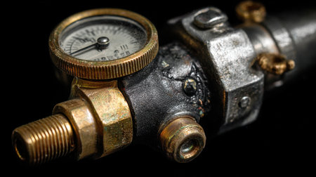 Intricate close-up of a vintage pressure gauge and brass pipe fitting, showcasing weathered details and textures against a dark background for industrial-themed projects.