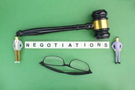 judge's hammer, little people, magnifying glass with the word negotiations. the concept of negotiation or discussion or deal concept