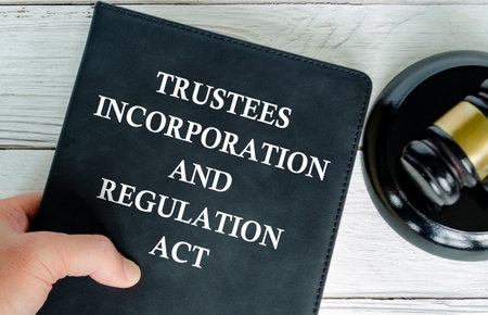 Hand holding Trustee Incorporation and Regulation Act book with gavel background.